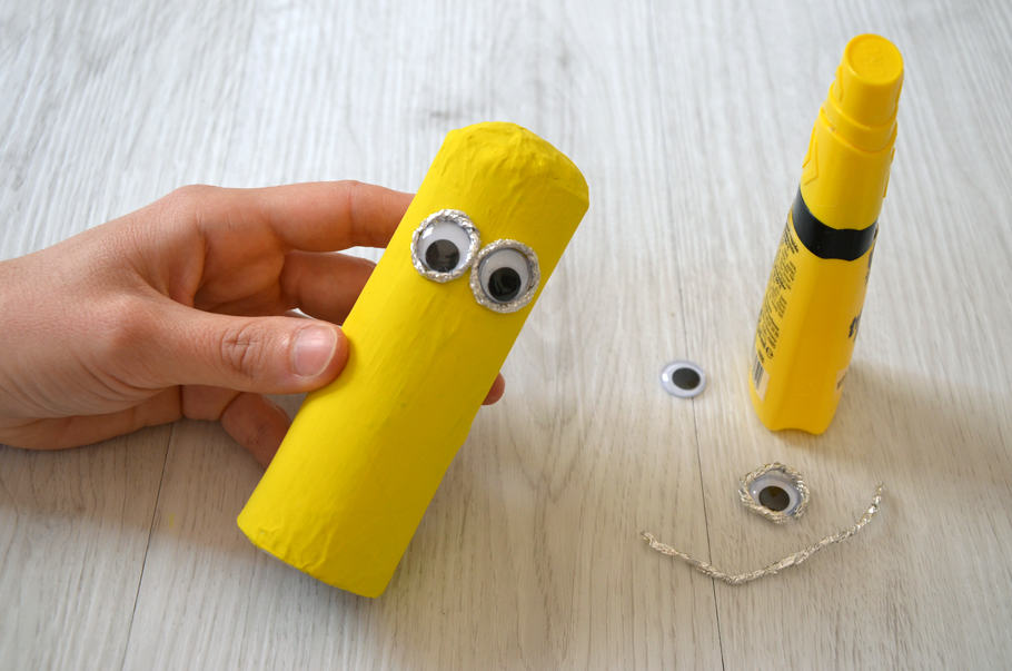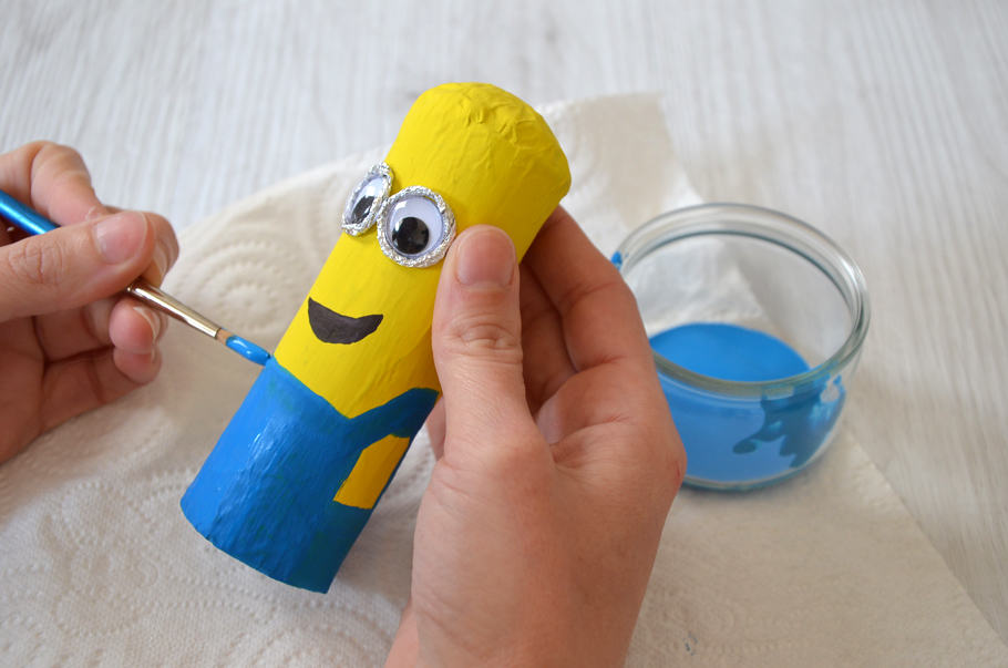 Remplissez aux ¾ les rouleaux coupés avec du papier journal. Formez une boule de papier journal en l’insérant en haut du rouleau, afin de former la tête du Minion. Fermez les extrémités du rouleau avec du ruban adhésif de marquage. - Découpez des bandelettes de papier journal, trempez-les dans la colle pour papier mâché et recouvrez entièrement votre rouleau. Laissez sécher.